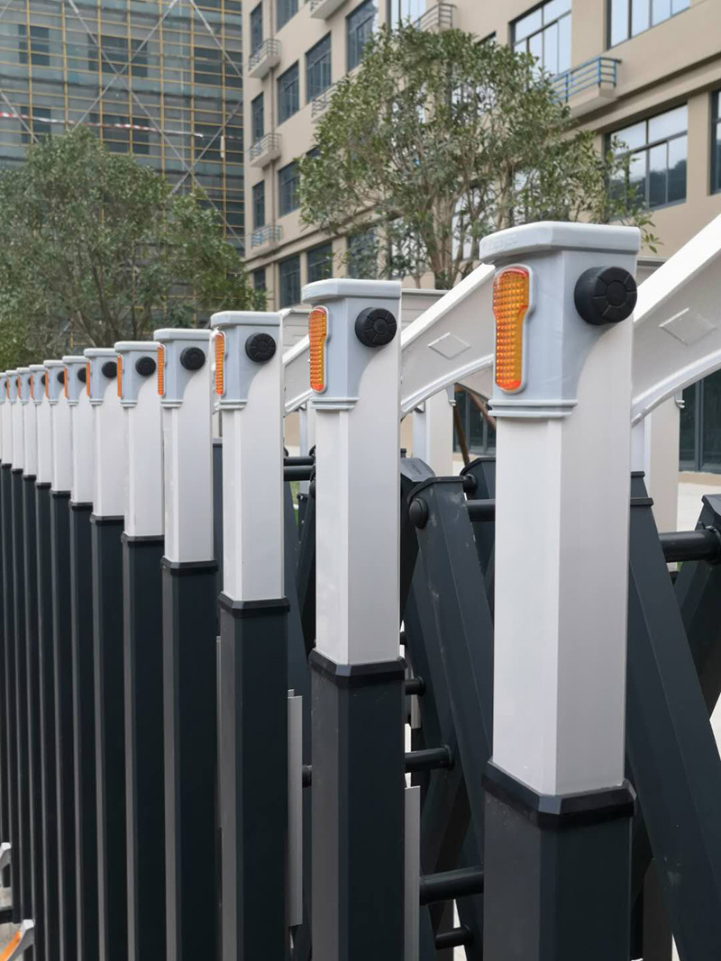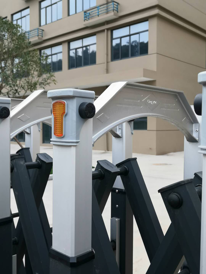 電動伸縮門主要由門體、驅動器、控制系統構成。伸縮門的門體采用優質鋁合金及普通方管管材制作,采用平行四邊形原理鉸接,伸縮靈活行程大。電動伸縮門的驅動器采用特種電機驅動,蝸桿蝸輪減速,并配有手動離合器,停電時可手動啟閉,伸縮門的控制系統有控制板,按鈕開關,另可根據用戶需求配備無線遙控裝置。