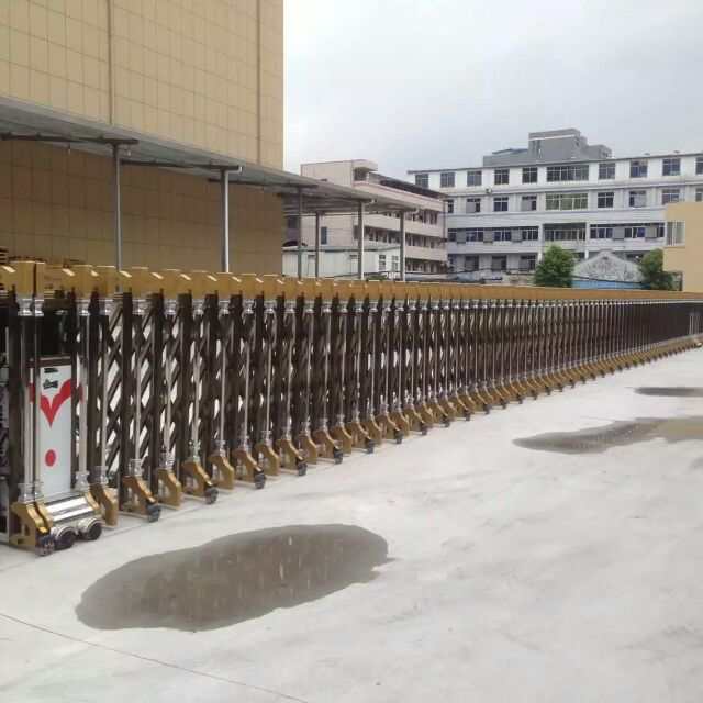 電動伸縮門主要由門體、驅(qū)動器、控制系統(tǒng)構(gòu)成。伸縮門的門體采用優(yōu)質(zhì)鋁合金及普通方管管材制作,采用平行四邊形原理鉸接,伸縮靈活行程大。電動伸縮門的驅(qū)動器采用特種電機(jī)驅(qū)動,蝸桿蝸輪減速,并配有手動離合器,停電時可手動啟閉,伸縮門的控制系統(tǒng)有控制板,按鈕開關(guān),另可根據(jù)用戶需求配備無線遙控裝置。